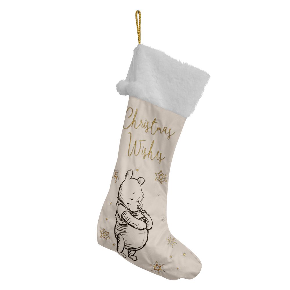 Give Santa the perfect place to leave those gifts with this beautiful white velveteen Winnie The Pooh stocking with gold embroidery. From Disney Classic Collectables - luxurious collectible gifts for the enduring Disney fan.