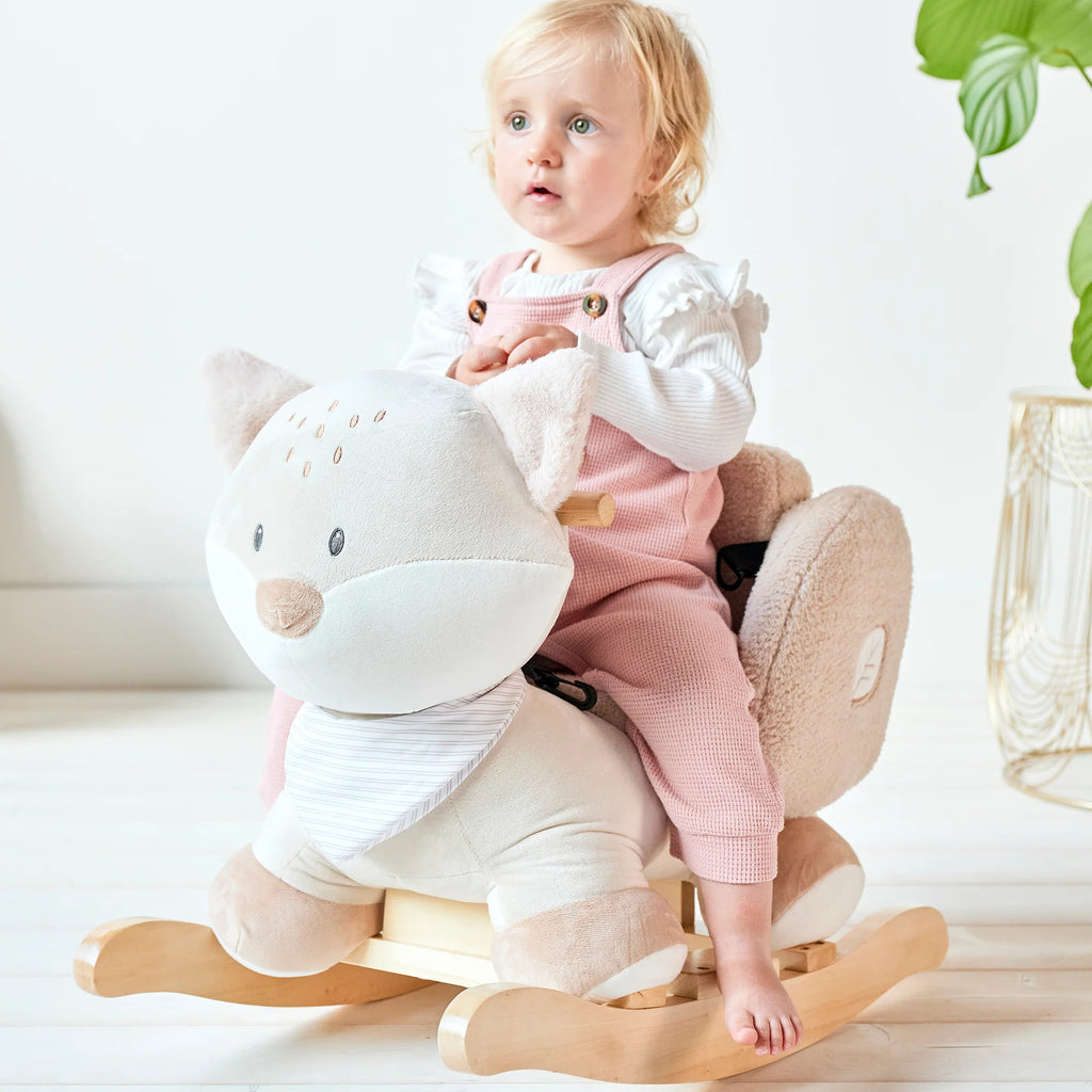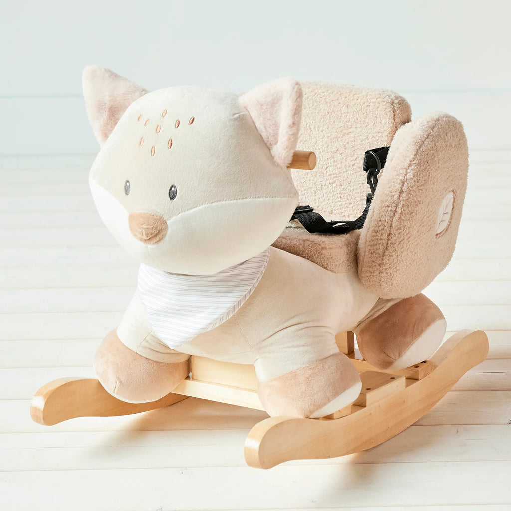 - Soft and cuddly fox rocking toy with a solid wooden base